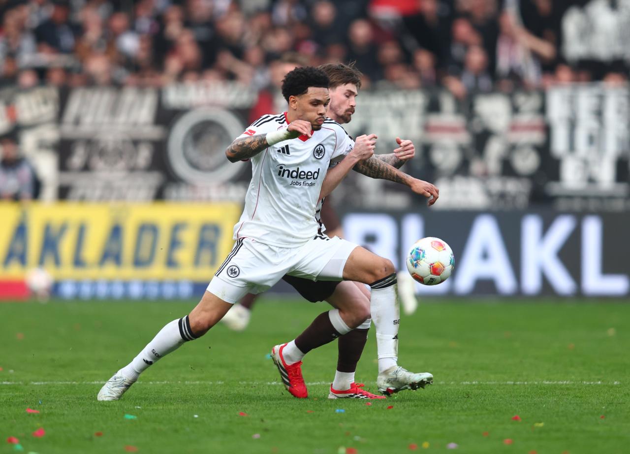 The absence of Omar Marmoush was evident on the team sheet as the Egyptian nears his departure, but Frankfurt were at their brilliant best in the opening half. Die Adler could have capitalised on a misplaced Gregor Kobel pass, however the Swiss shot-stopper got a boot to Hugo Larsson’s shot.