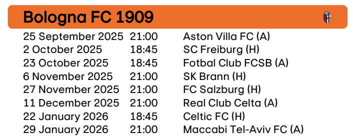 Bologna kick off Europa League with tricky trip to Aston Villa