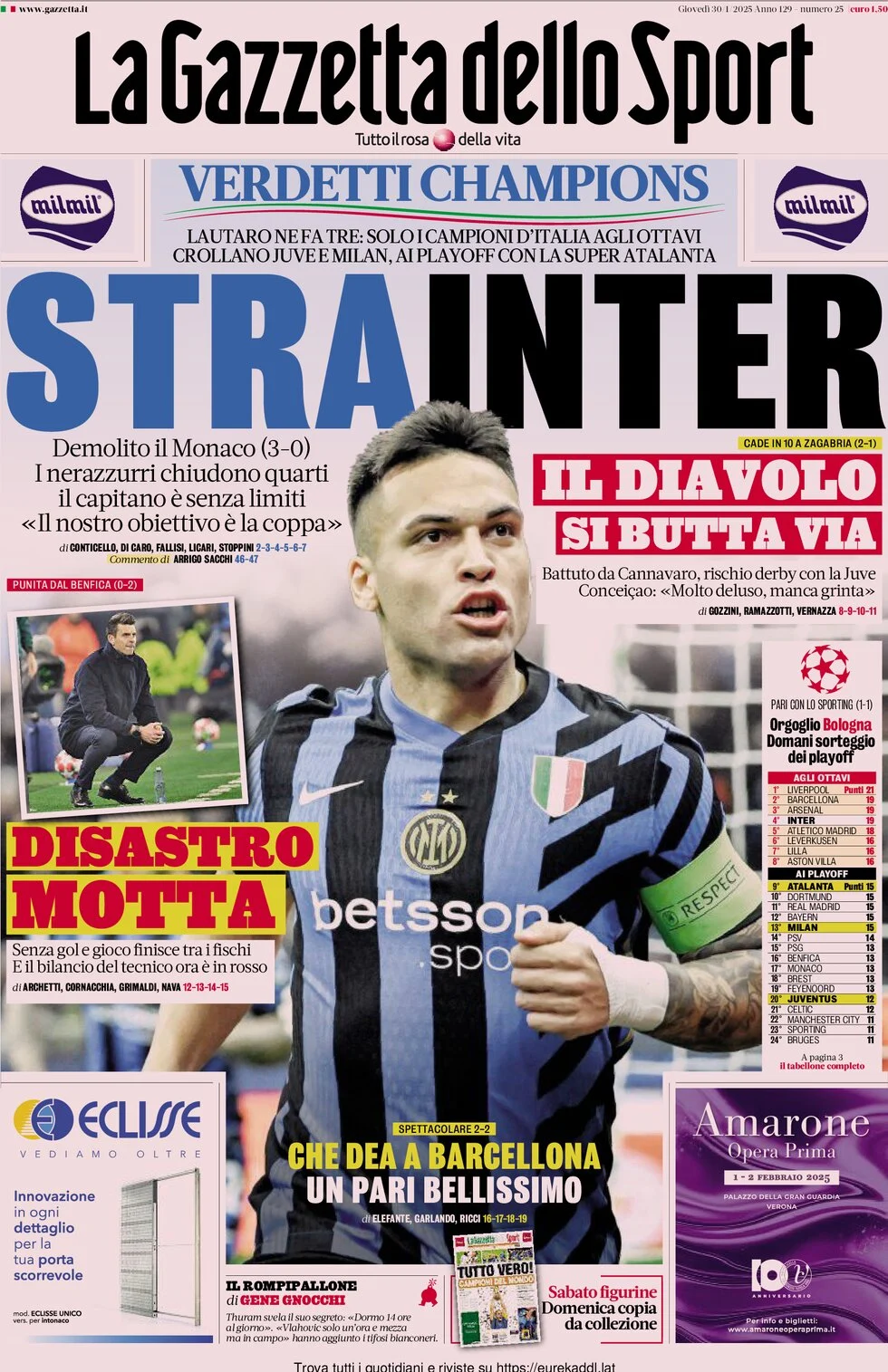 Ranking, negative night. Thiago loses 2-0 at home against Benfica and could meet Leao defeated in Zagreb. Lautaro, scorer of three goals against Monaco, is the risk for those qualified. Atalanta 2-2 against Barça. Now Sporting or Brugge. Draw tomorrow.